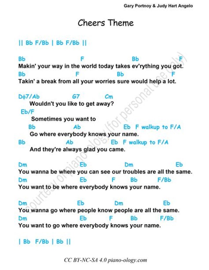 The Cheers theme lyrics encapsulate a sense of nostalgia and camaraderie that resonates with many. The famous sitcom "Cheers," which aired from 1982 to 1993, captured the hearts of audiences with its unforgettable characters and their heartfelt stories. The theme song, "Where Everybody Knows Your Name," written by Gary Portnoy and Judy Hart Angelo, serves as an anthem for friendship and belonging. It invites listeners to reminisce about the good times shared with friends and loved ones, creating an emotional bond that transcends mere entertainment.