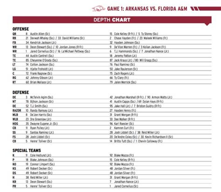 The Arkansas football depth chart is a crucial aspect of the team’s strategy, showcasing the players' positions, strengths, and roles within the squad. Understanding the depth chart can provide fans and analysts with insights into how the team is structured and who to watch during the upcoming season. In this article, we will explore the intricacies of the Arkansas football depth chart, its significance, and what it means for the team’s performance.