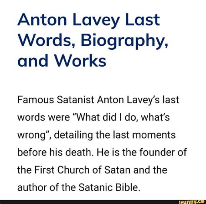 Anton LaVey's last words hold a profound significance in understanding the man behind the controversial figure of the Church of Satan. His contributions to modern Satanism have sparked debates and discussions that continue to resonate today. In this article, we will explore LaVey's life, his philosophies, and the impact of his final words. By the end of this exploration, readers will gain insights into LaVey's legacy and the ideologies that shaped his worldview.
