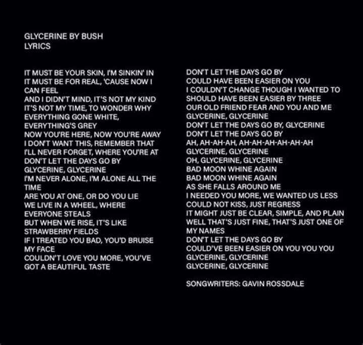 "Glycerine" is a hauntingly beautiful song by the British rock band Bush, released in 1994. The lyrics of this song have resonated with many listeners over the years, capturing themes of love, longing, and vulnerability. In this article, we will delve deep into the meaning behind the lyrics, the context of the song's creation, and its impact on music and culture. Whether you're a long-time fan or a newcomer to Bush's music, this exploration will shed light on why "Glycerine" continues to be relevant today.