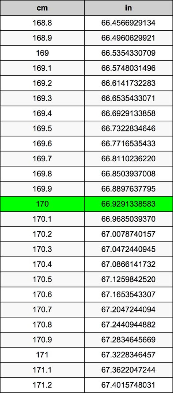 - 170 cm ÷ 2.54 = 66.9299 inches